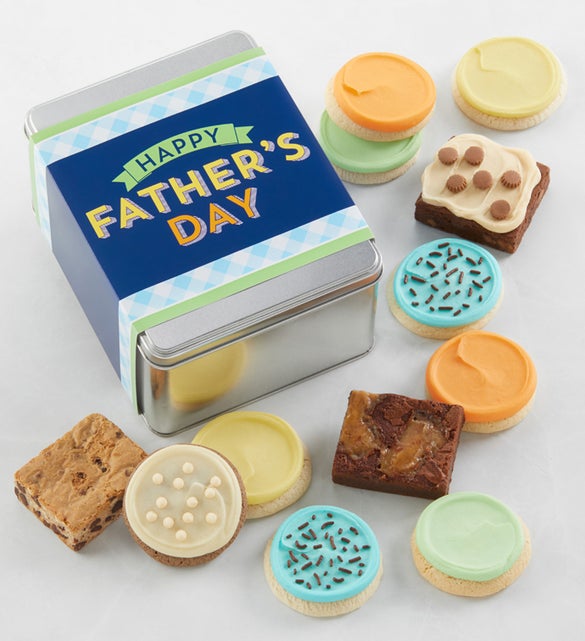 A sweet present for a sweet dad: a tin filled with baked goods galore. In addition to buttercream-frosted favorites, the gift includes a blondie walnut bar, a toffee almond crunch bar, and a peanut butter-frosted brownie. The tin is adorned with a "Happy Father's Day" message to make it even more special. OU-D 12 pieces