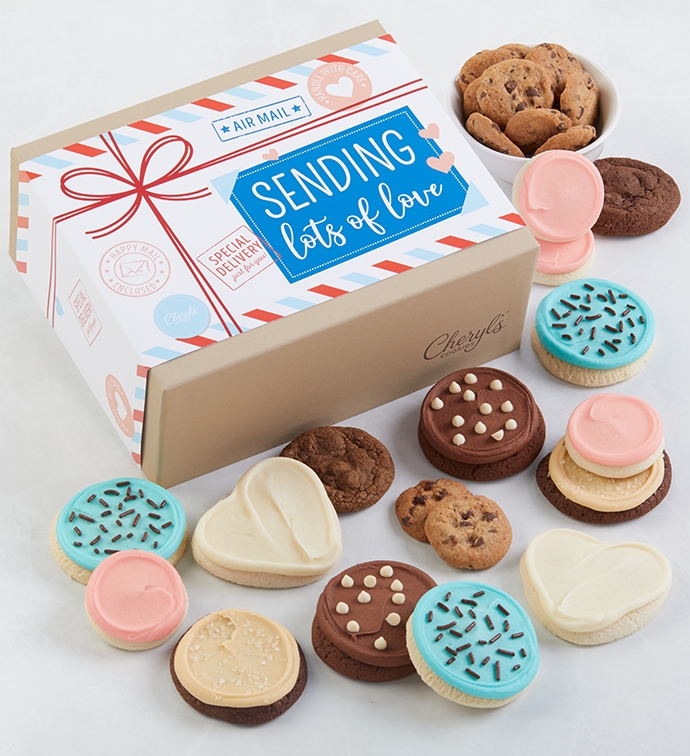 Check in on friends and family members with a special and sweet delivery. This party in a box is filled with irresistible treats, starting with snack-size chocolate obsession, crunchy chocolate chip, and buttercream-frosted sugar cookies. They'll also enjoy full-size buttercream-frosted sugar cookies made from our signature cutout dough as well as devil's food chocolate and salty caramel cookies. Whether it's to keep in touch or lift someone's spirits, this gift that says "Sending Lots of Love" is a thoughtful way to show you care. OU-D 27 pieces