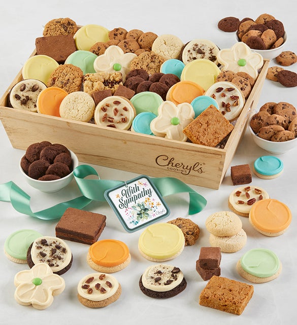 If you can't be there in person to offer condolences, send this gourmet gift brimming with individually wrapped baked goods to show your love and support. Each basket is carefully arranged with an assortment of buttercream-frosted sugar cookies, snack-size treats, and brownies, making it perfect for a family or group gathering. Tied with a bow and marked with a "With Sympathy" hangtag, this heartwarming gift will feel like a great big hug once it arrives on their doorstep. Choose from three sizes: medium, large, or premier. OU-D 94 pieces